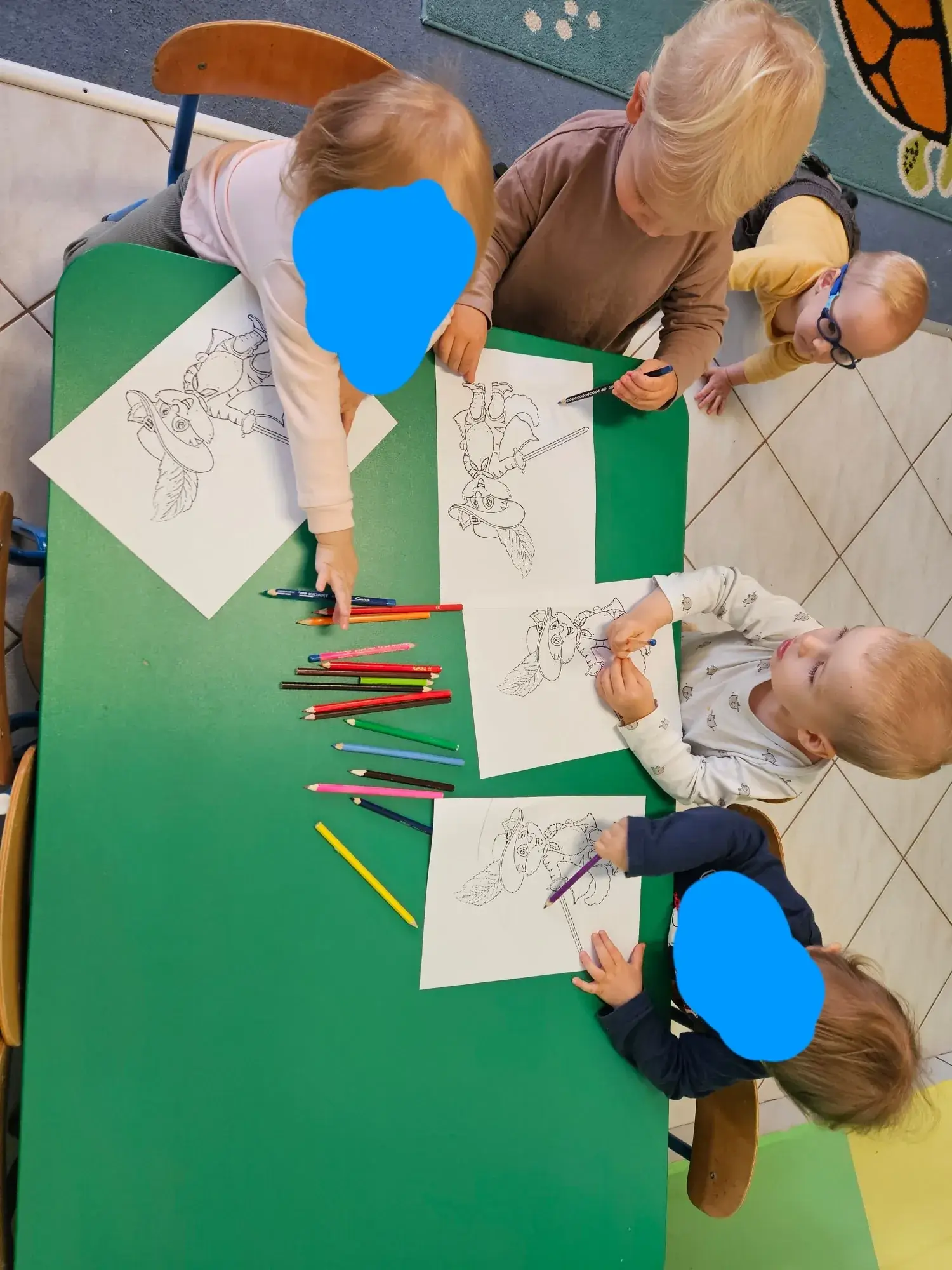 Najwięcej radości sprawił finał opowieści, w którym wspólnie pomogliśmy bohaterowi złapać olbrzyma zamienionego w myszkę – w tej roli wystąpił kolorowy balon. Śmiechom nie było końca! Aby łagodnie zakończyć spotkanie, dzieci zajęły się kolorowaniem tematycznych obrazków. Praca z kolorowanką pozwoliła maluchom wyciszyć się po aktywnościach ruchowych i rozwijać sprawność rączek oraz kreatywność.