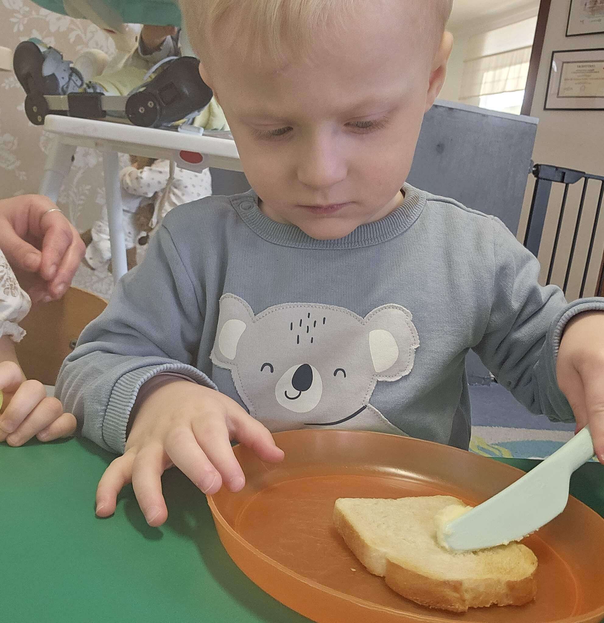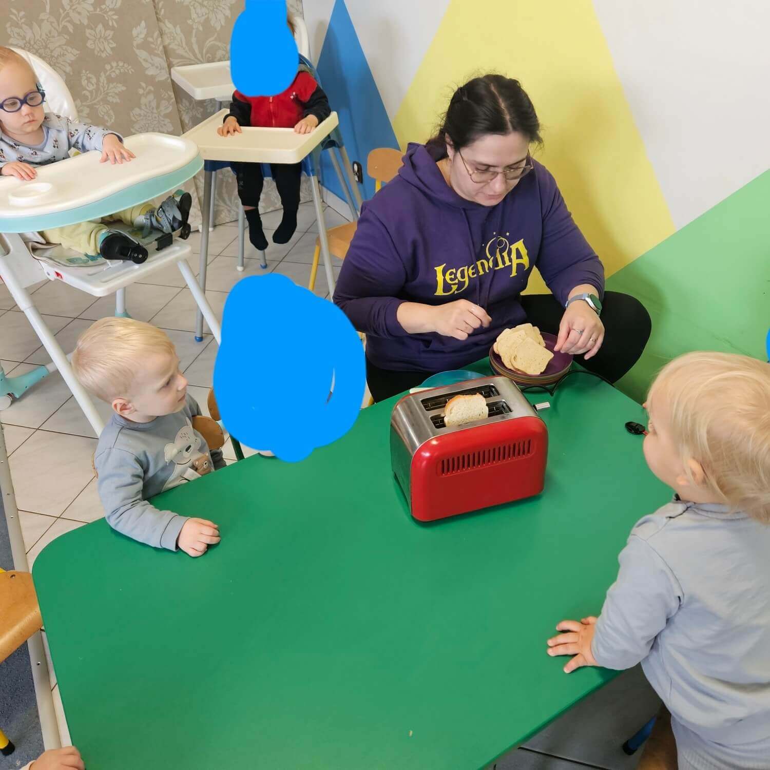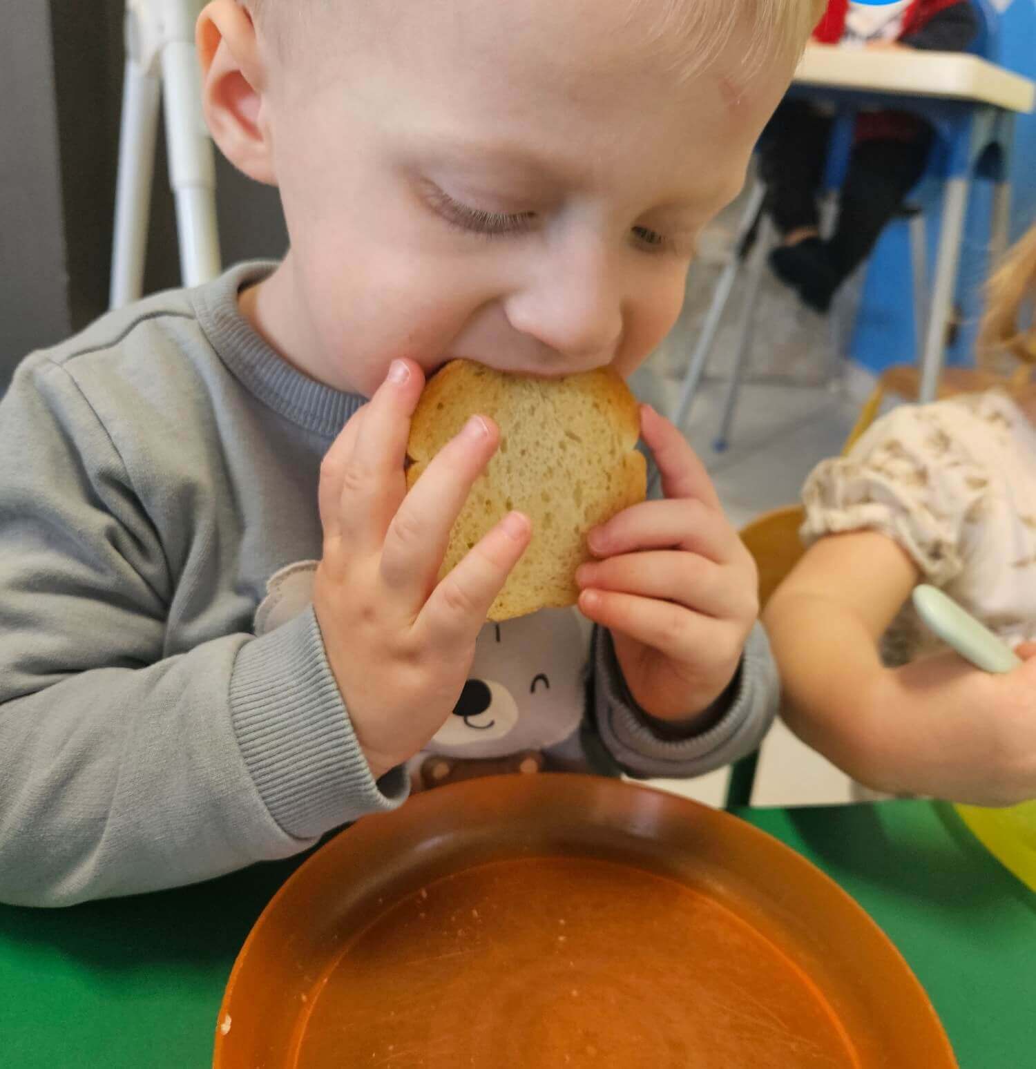 Kiedy tosty były już gotowe, przeszliśmy do najprzyjemniejszej części. Każdy chętny mógł samodzielnie posmarować swoją kanapkę masełkiem. To zadanie wymagało skupienia i precyzji, ale dało dzieciom mnóstwo satysfakcji. Na koniec z wielkim smakiem zjedliśmy owoce naszej pracy!