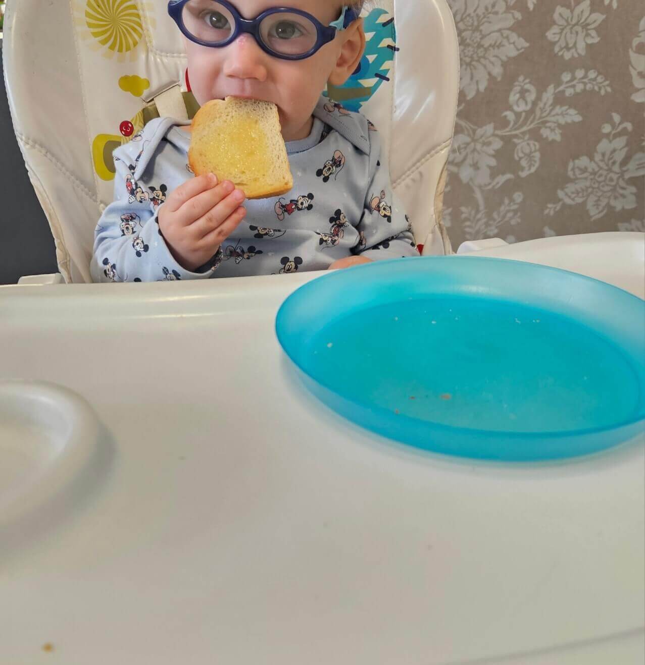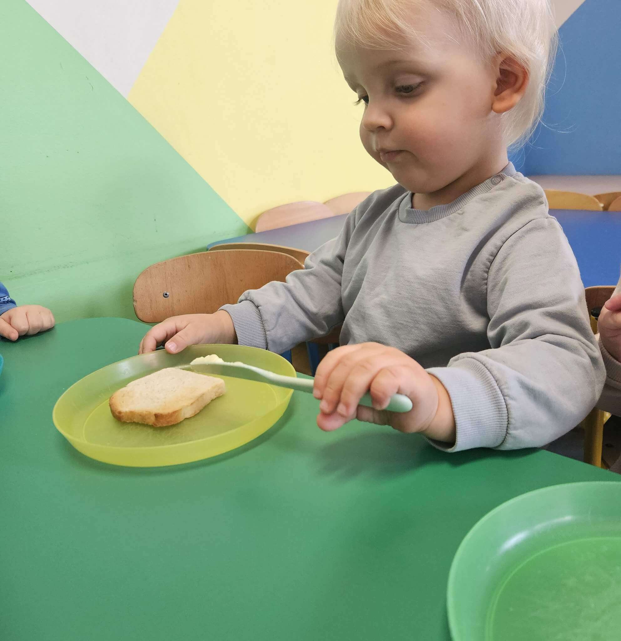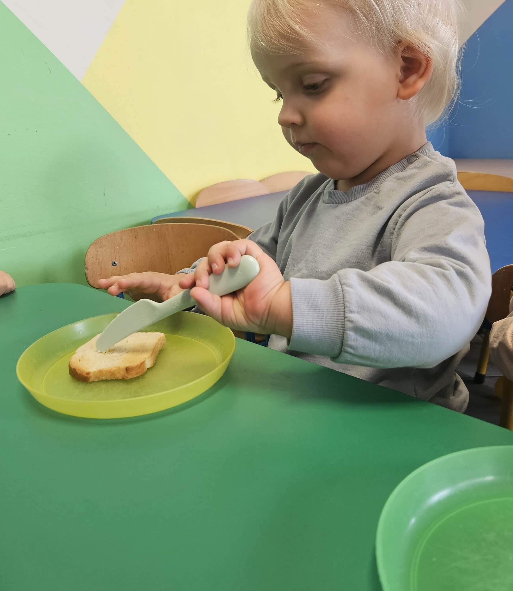 Kiedy tosty były już gotowe, przeszliśmy do najprzyjemniejszej części. Każdy chętny mógł samodzielnie posmarować swoją kanapkę masełkiem. To zadanie wymagało skupienia i precyzji, ale dało dzieciom mnóstwo satysfakcji. Na koniec z wielkim smakiem zjedliśmy owoce naszej pracy!