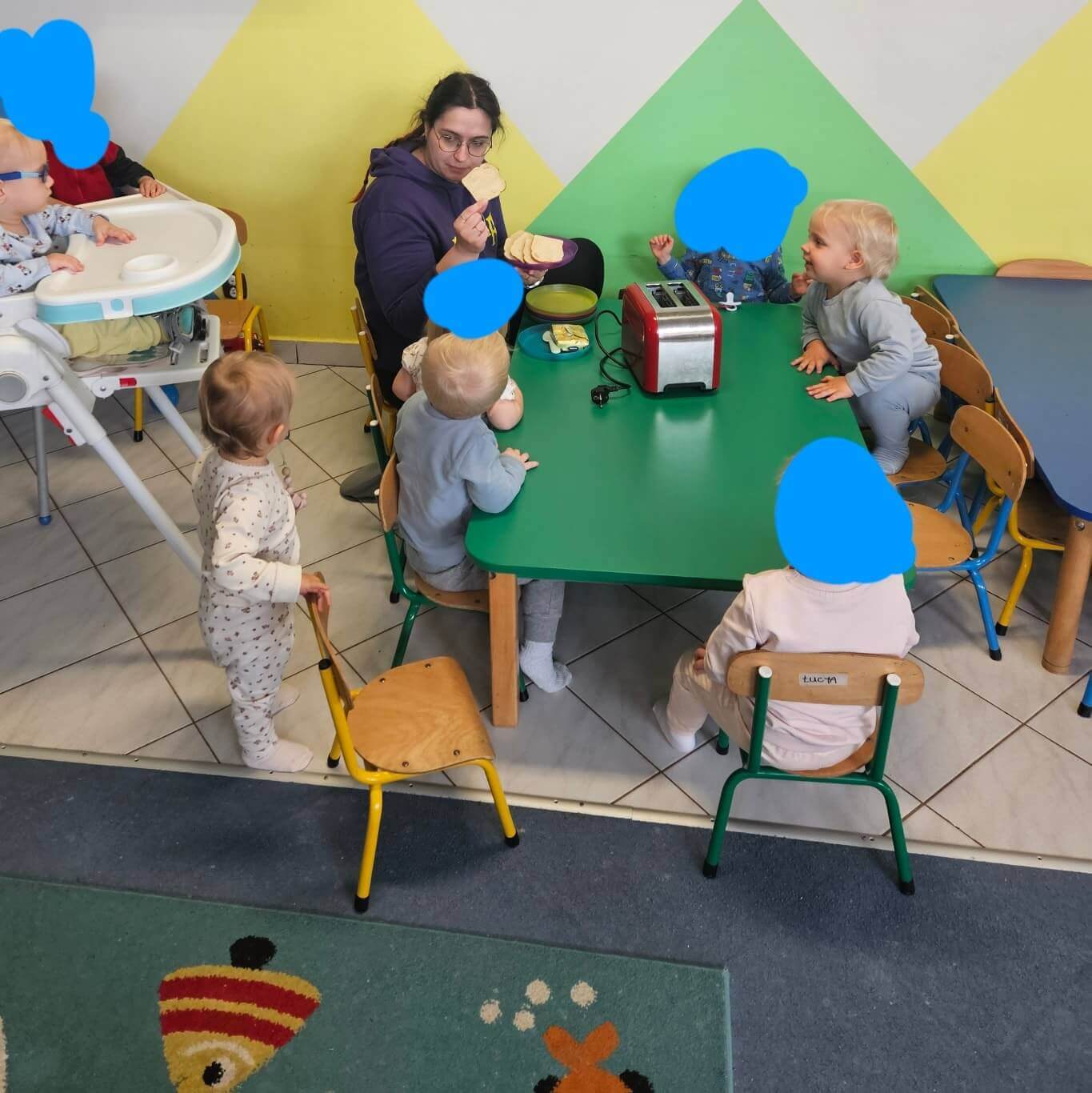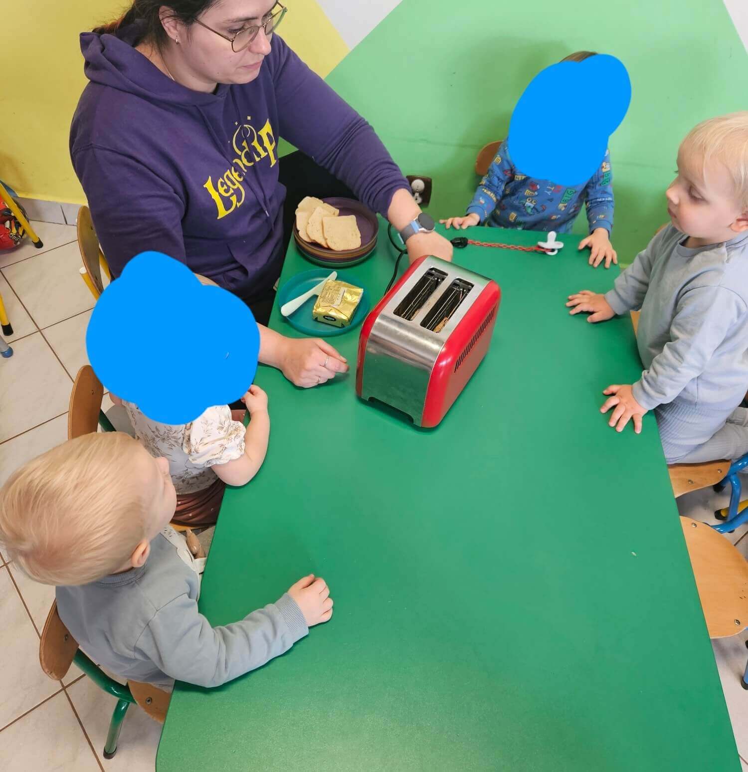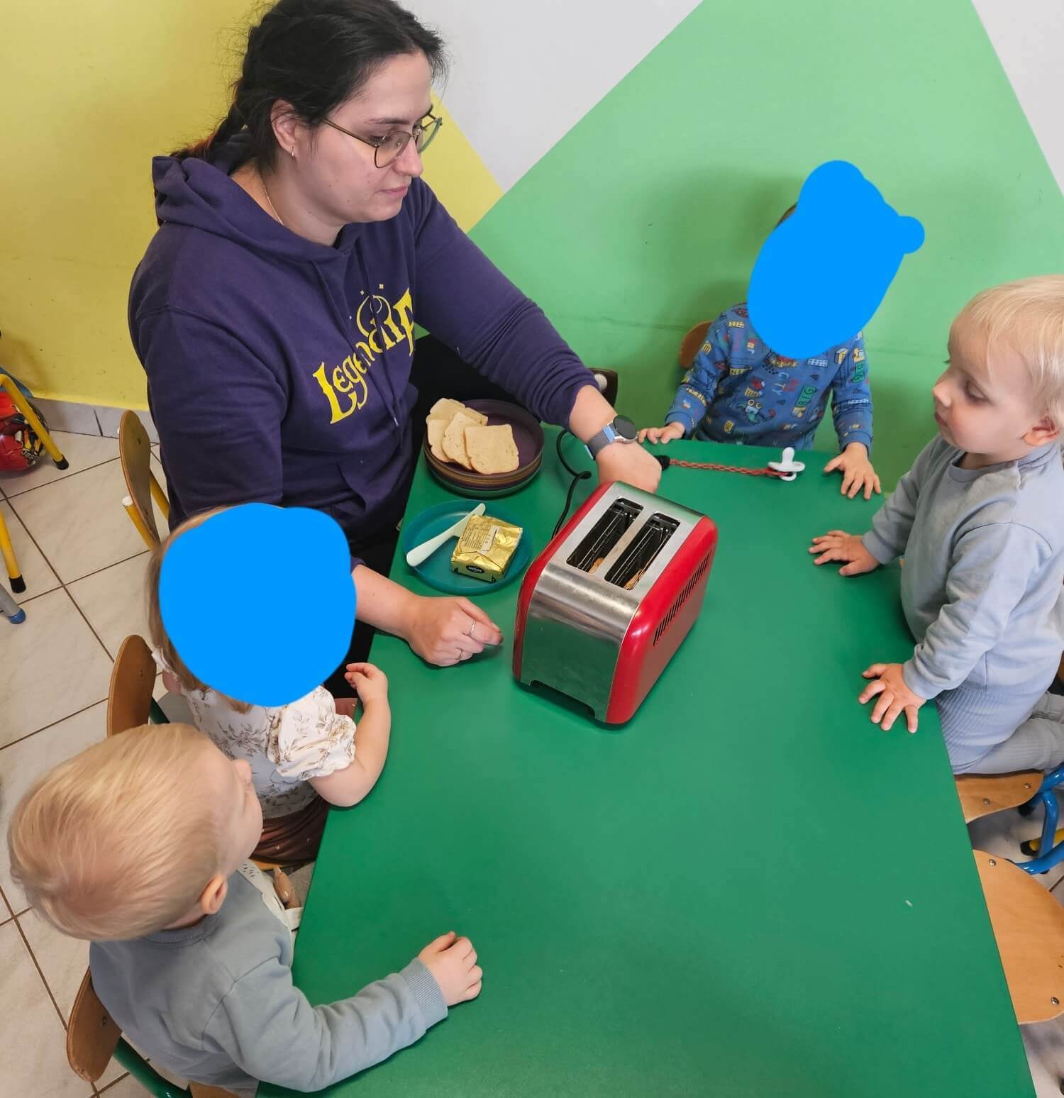 Zanim przystąpiliśmy do pracy, poświęciliśmy chwilę na naukę. Rozmawialiśmy o tym, jak działa toster i dlaczego należy korzystać z niego ostrożnie. Wiedza o tym, jak bezpiecznie używać sprzętów kuchennych, jest niezwykle ważna, aby każdy mały kucharz w przedszkolu mógł czerpać radość z gotowania bez ryzyka oparzenia.