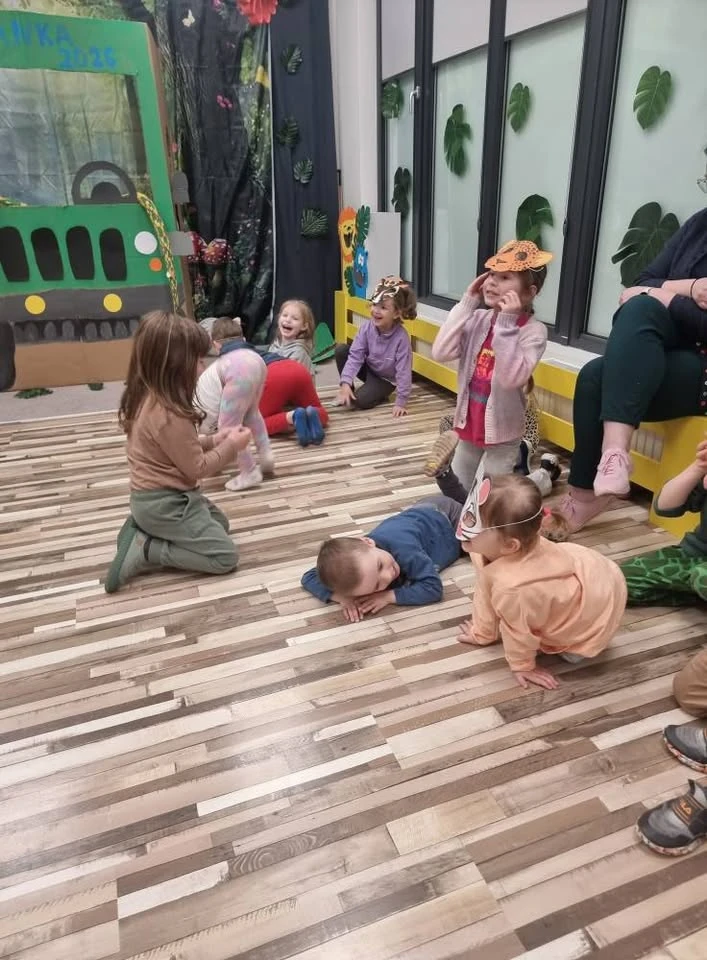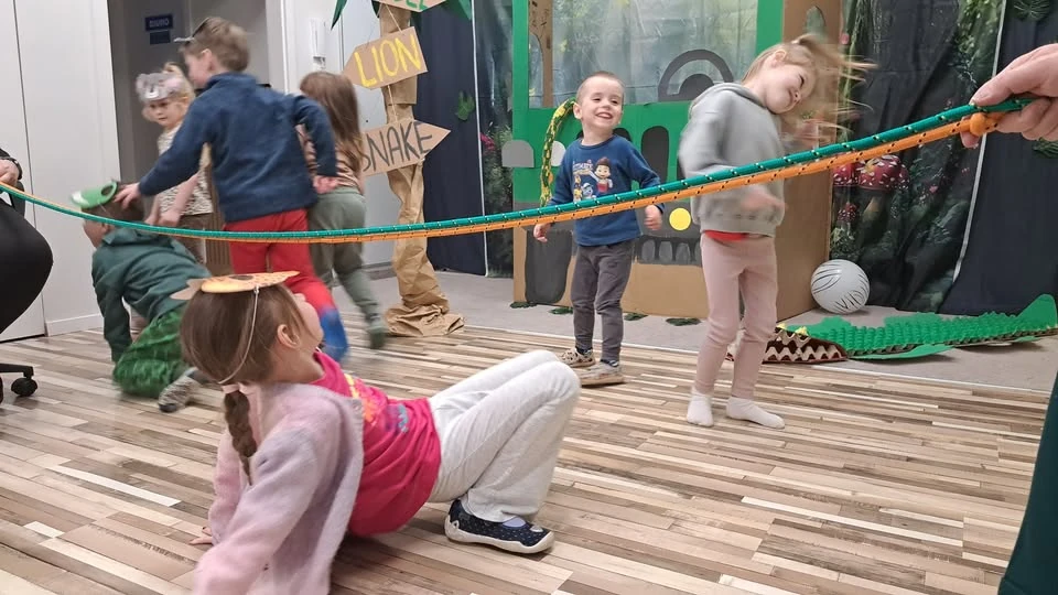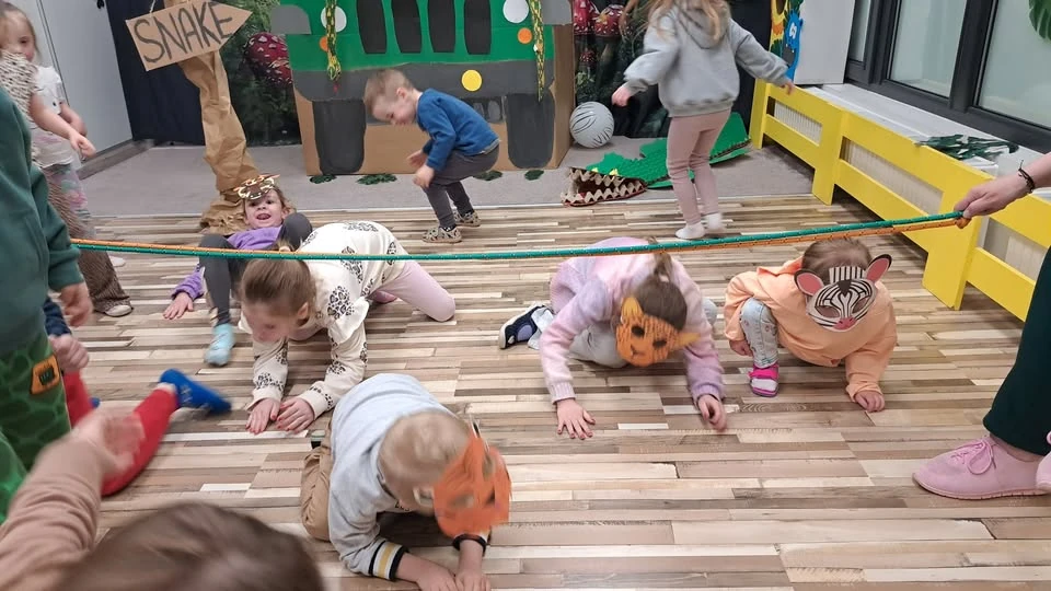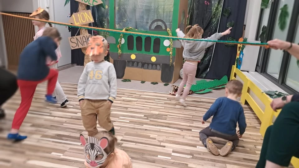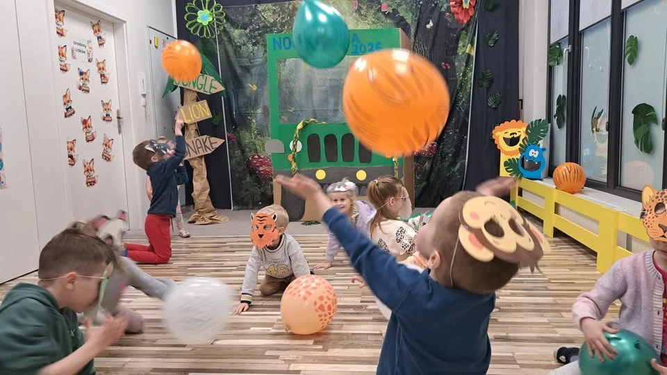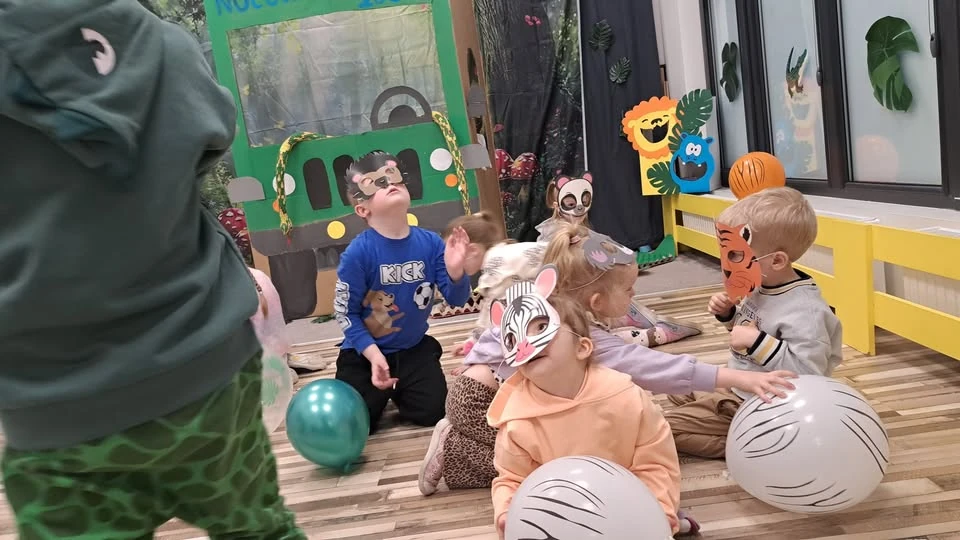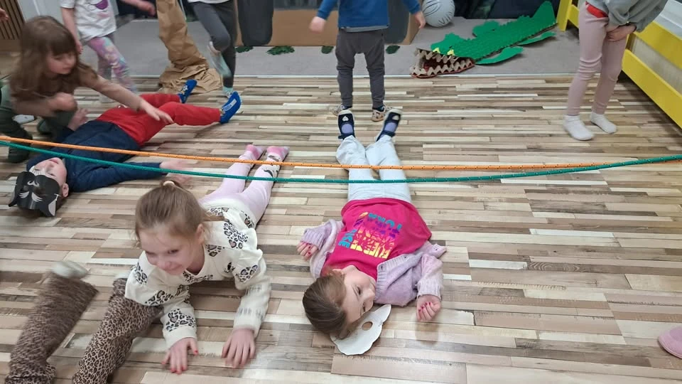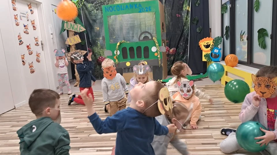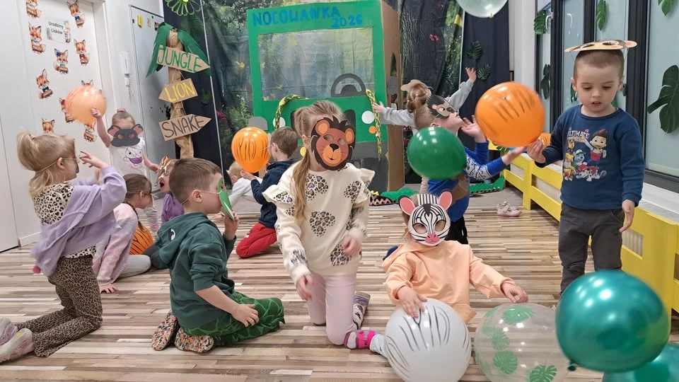 Na czas tego wyjątkowego wieczoru nasze sale zamieniły się w gęstą dżunglę, a dzieci przeobraziły się w radosne, dzikie zwierzęta. Mali odkrywcy z wielkim zaangażowaniem pokonywali przygotowane tory przeszkód, wykazując się zwinnością i odwagą.