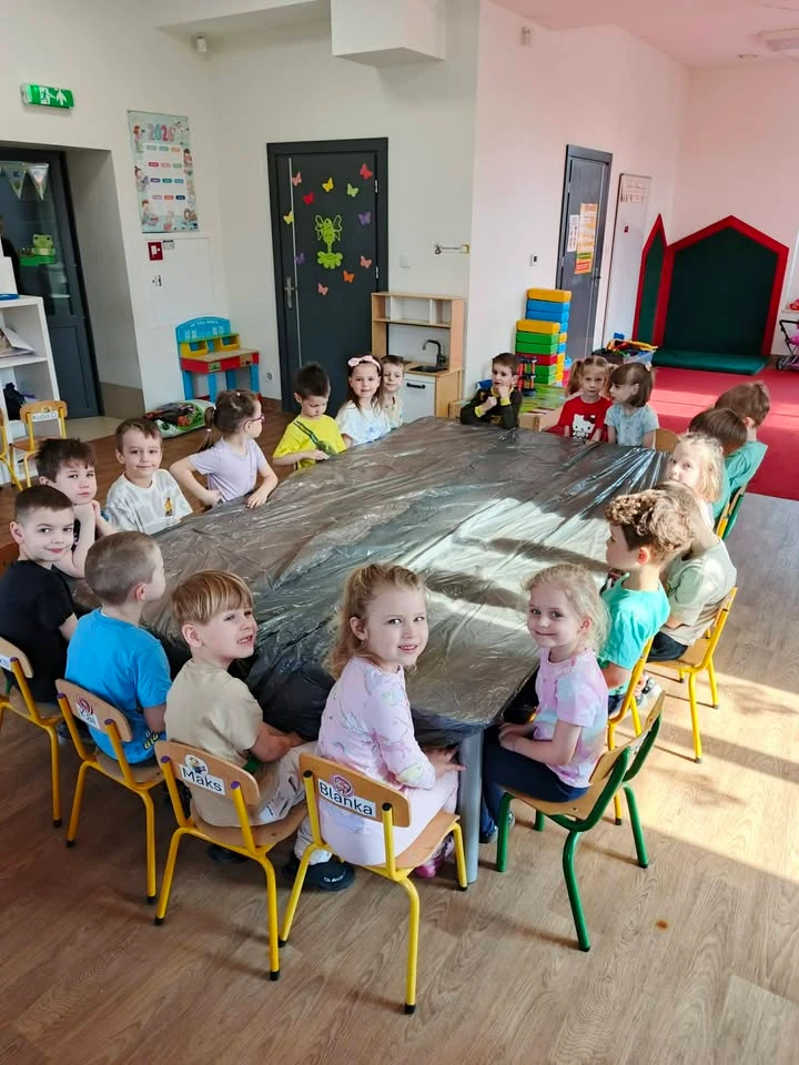 Prace z ziemią i sadzonkami to jednak nie wszystko! Nasze zdolne Żabki postanowiły urozmaicić swój zielony kącik także artystycznie. Dzieci wspólnie stworzyły przepiękny, kolorowy rysunek, który idealnie dopełnił wiosenny wystrój ich sali.