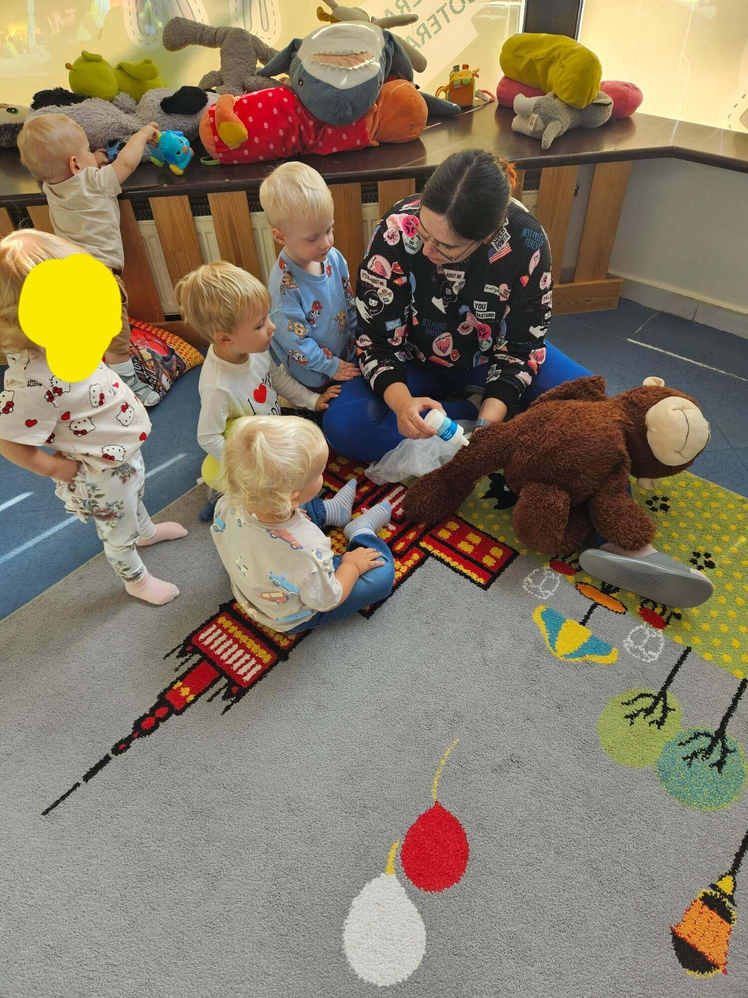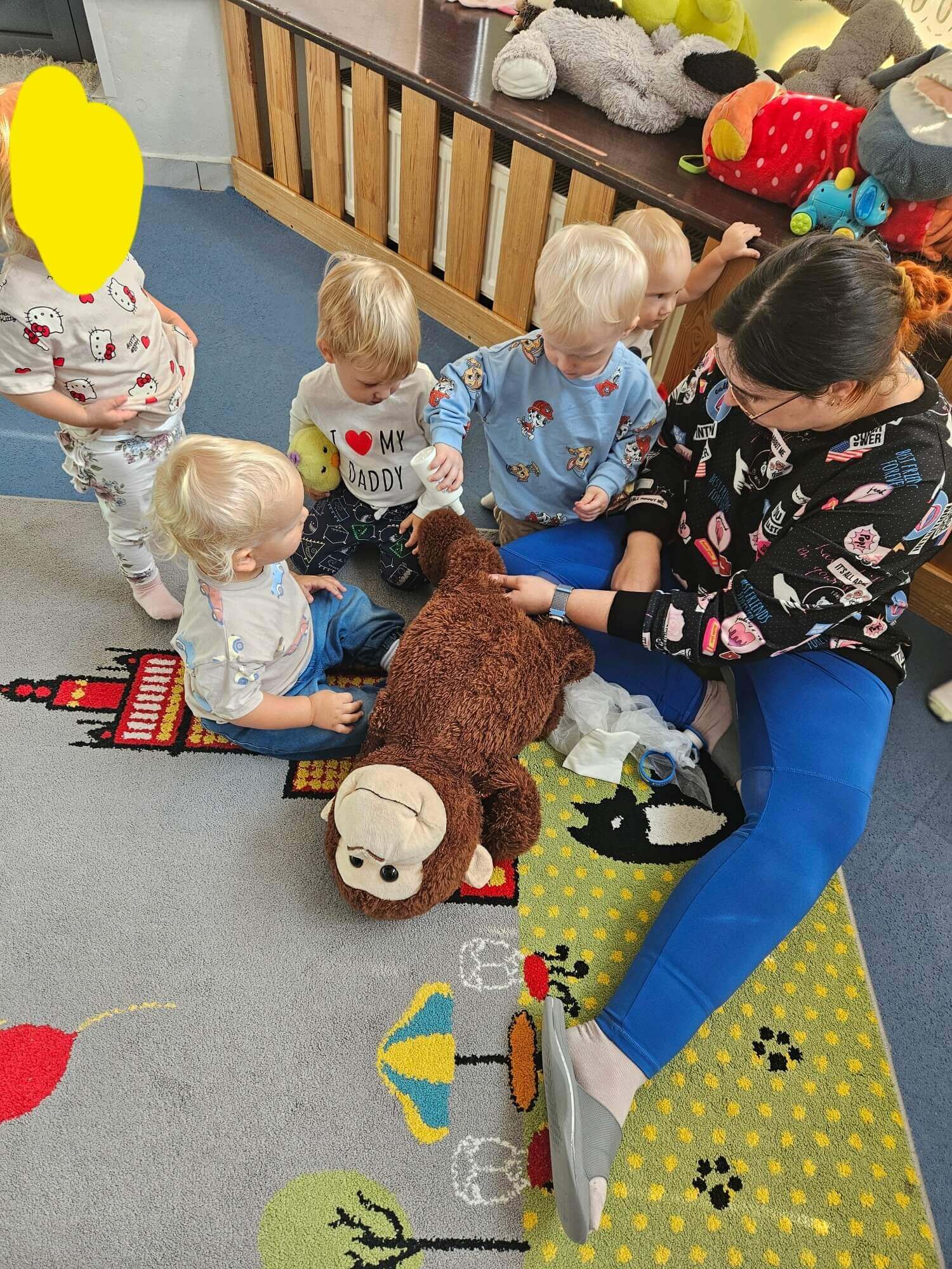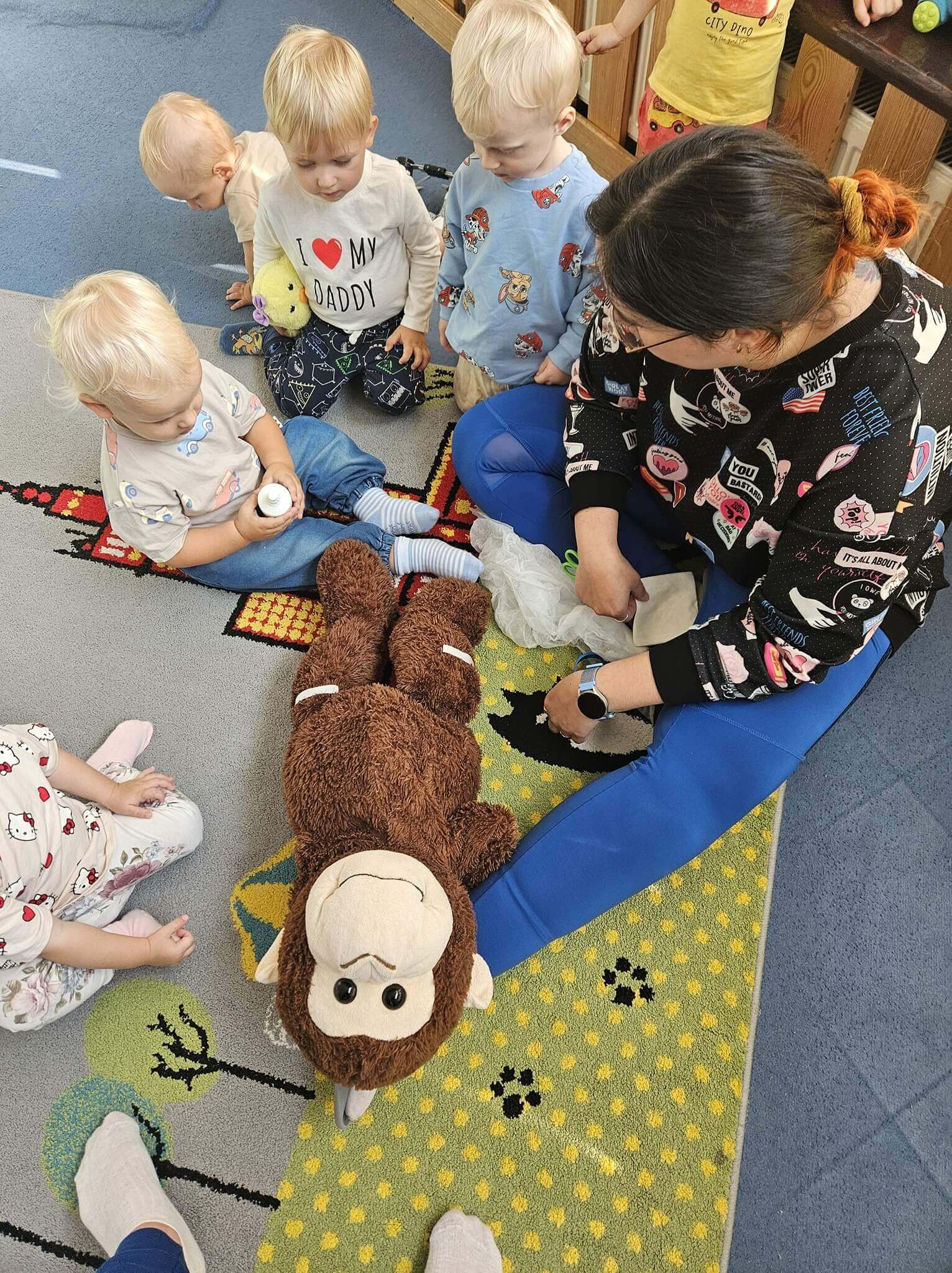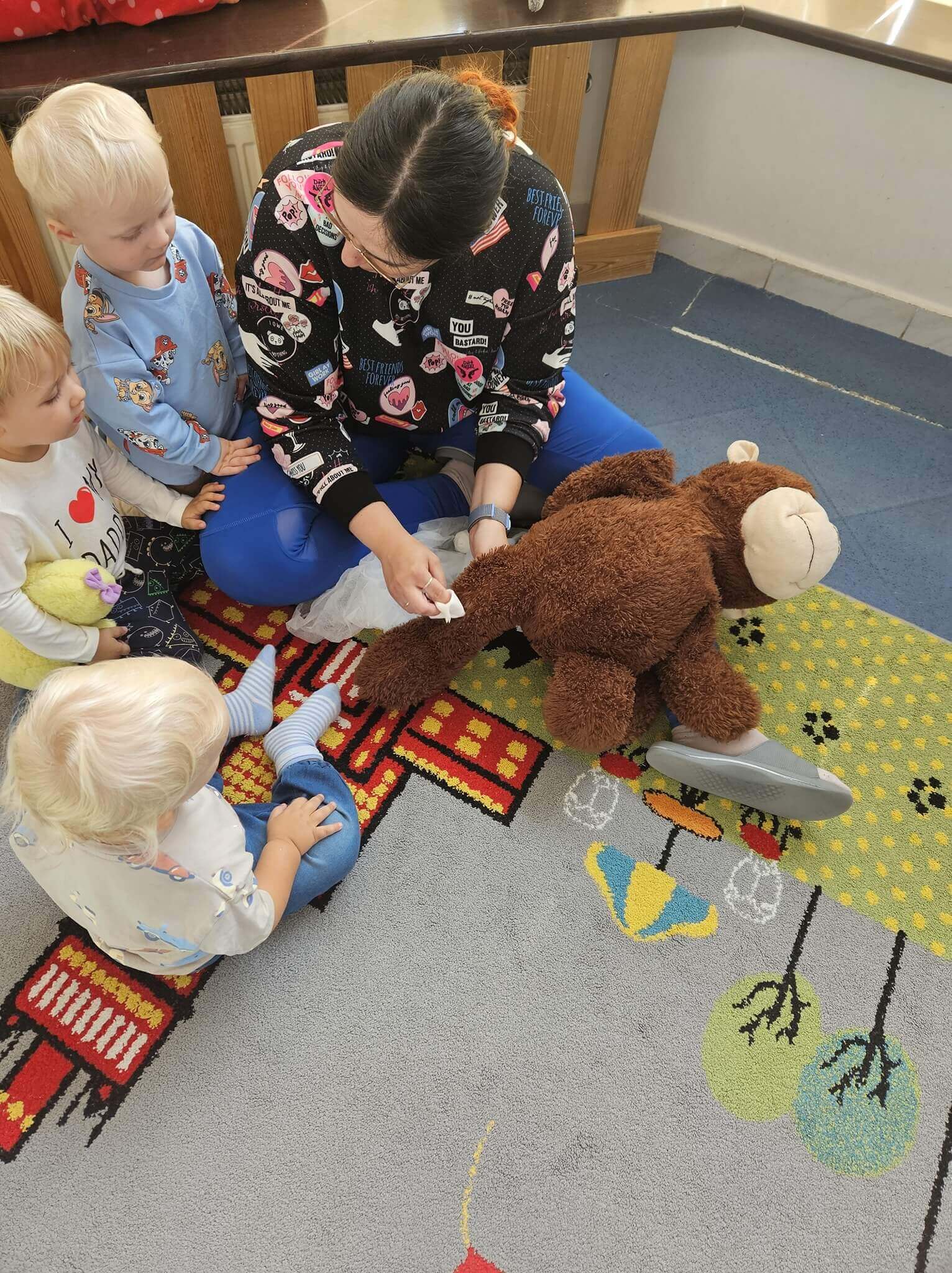 Podczas zajęć naszym wyjątkowym „pacjentem” była pluszowa małpka. Każde dziecko mogło samodzielnie opatrzyć jej „ranę”: oczyścić ją wodą utlenioną, delikatnie osuszyć, przykleić plasterek i założyć bandaż.