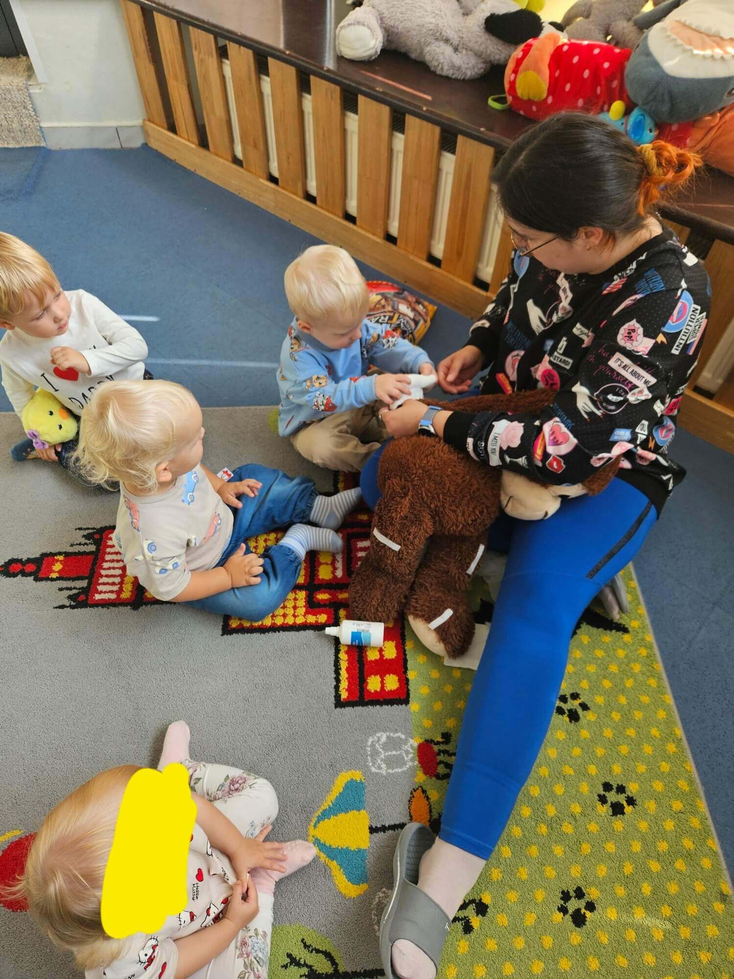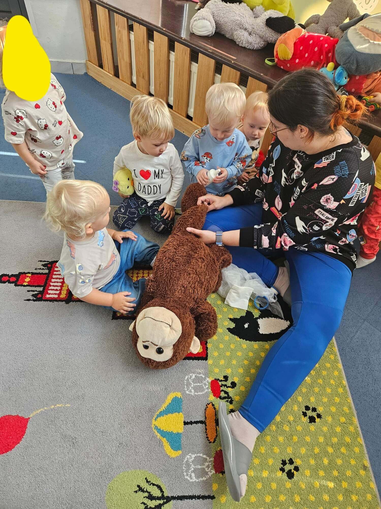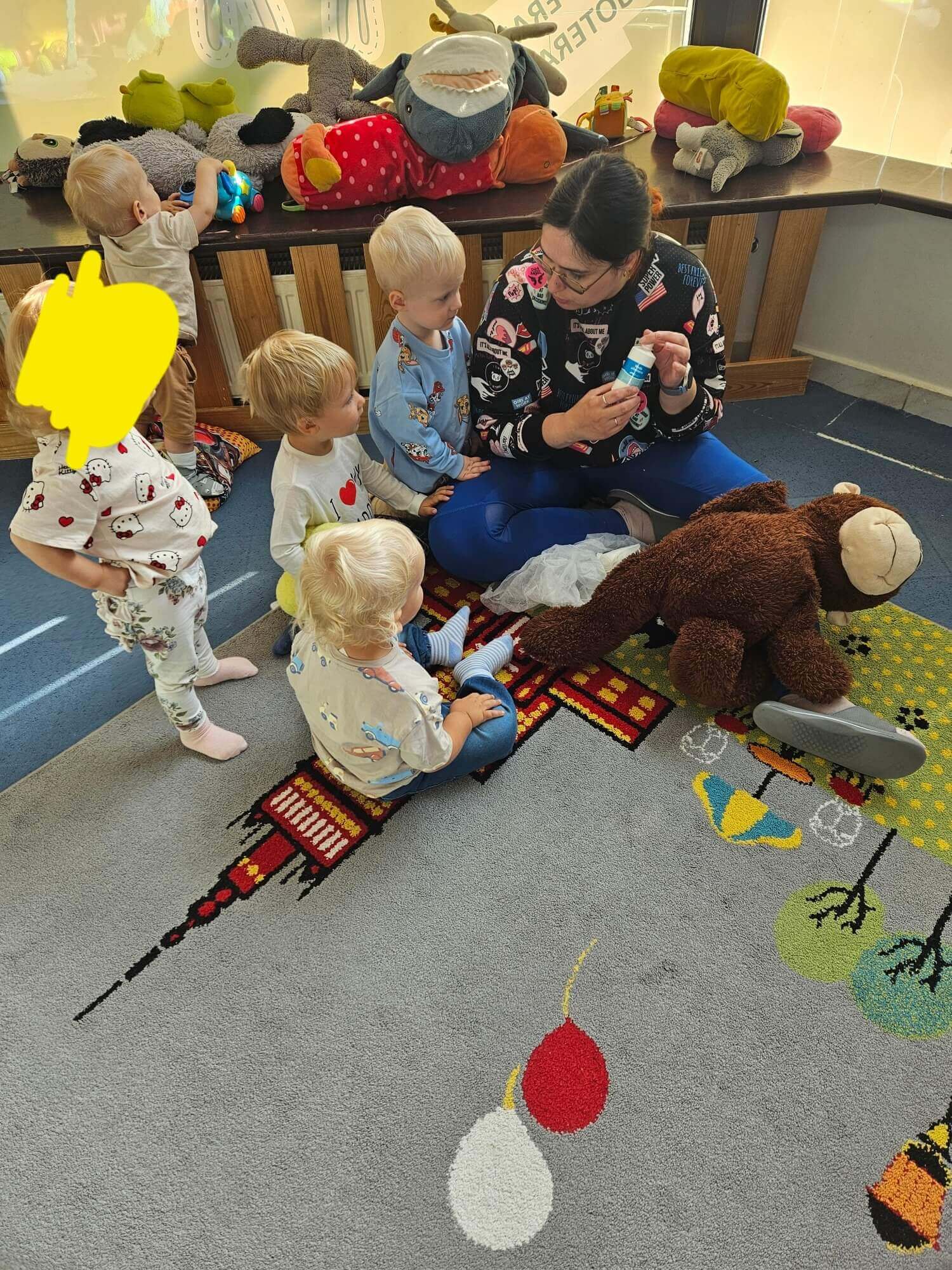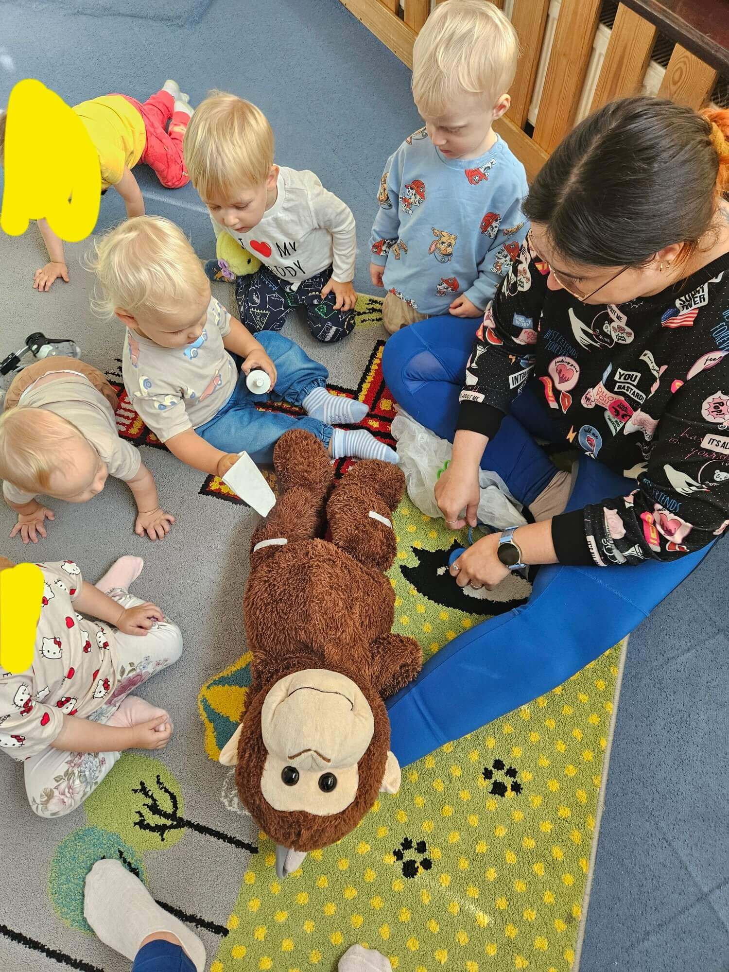 Podczas zajęć naszym wyjątkowym „pacjentem” była pluszowa małpka. Każde dziecko mogło samodzielnie opatrzyć jej „ranę”: oczyścić ją wodą utlenioną, delikatnie osuszyć, przykleić plasterek i założyć bandaż.