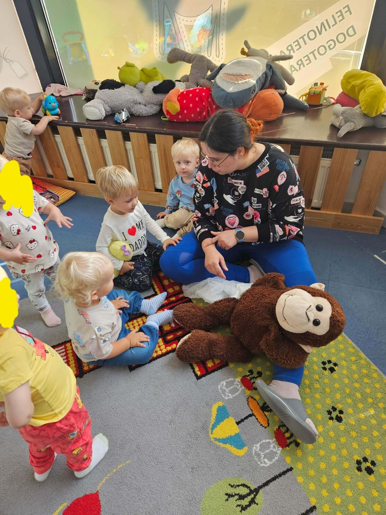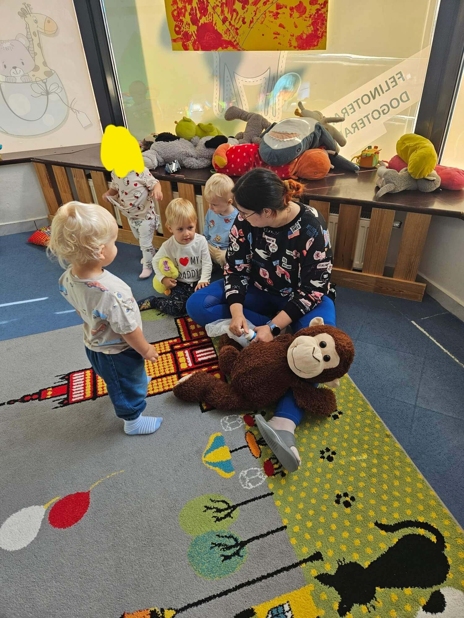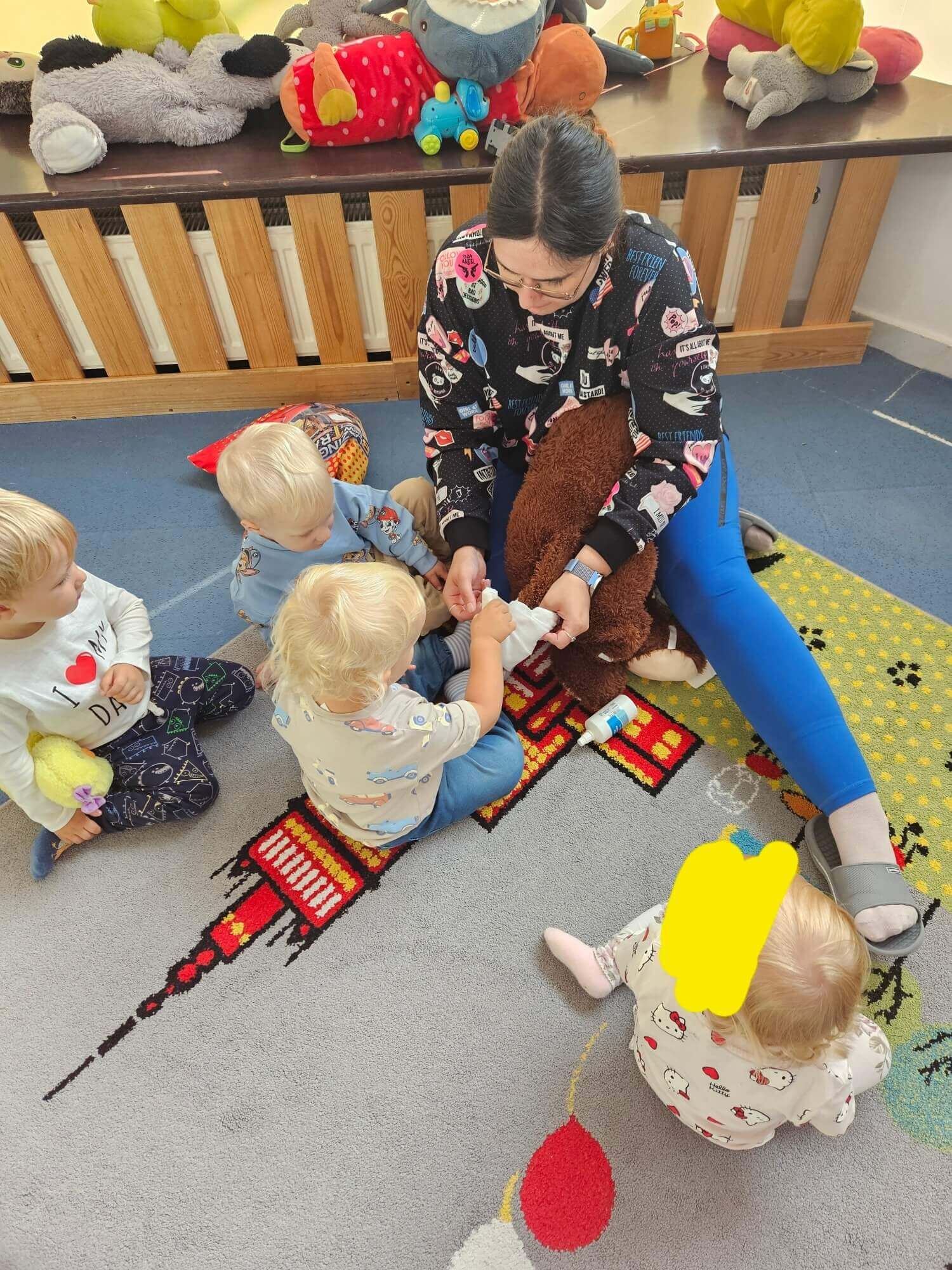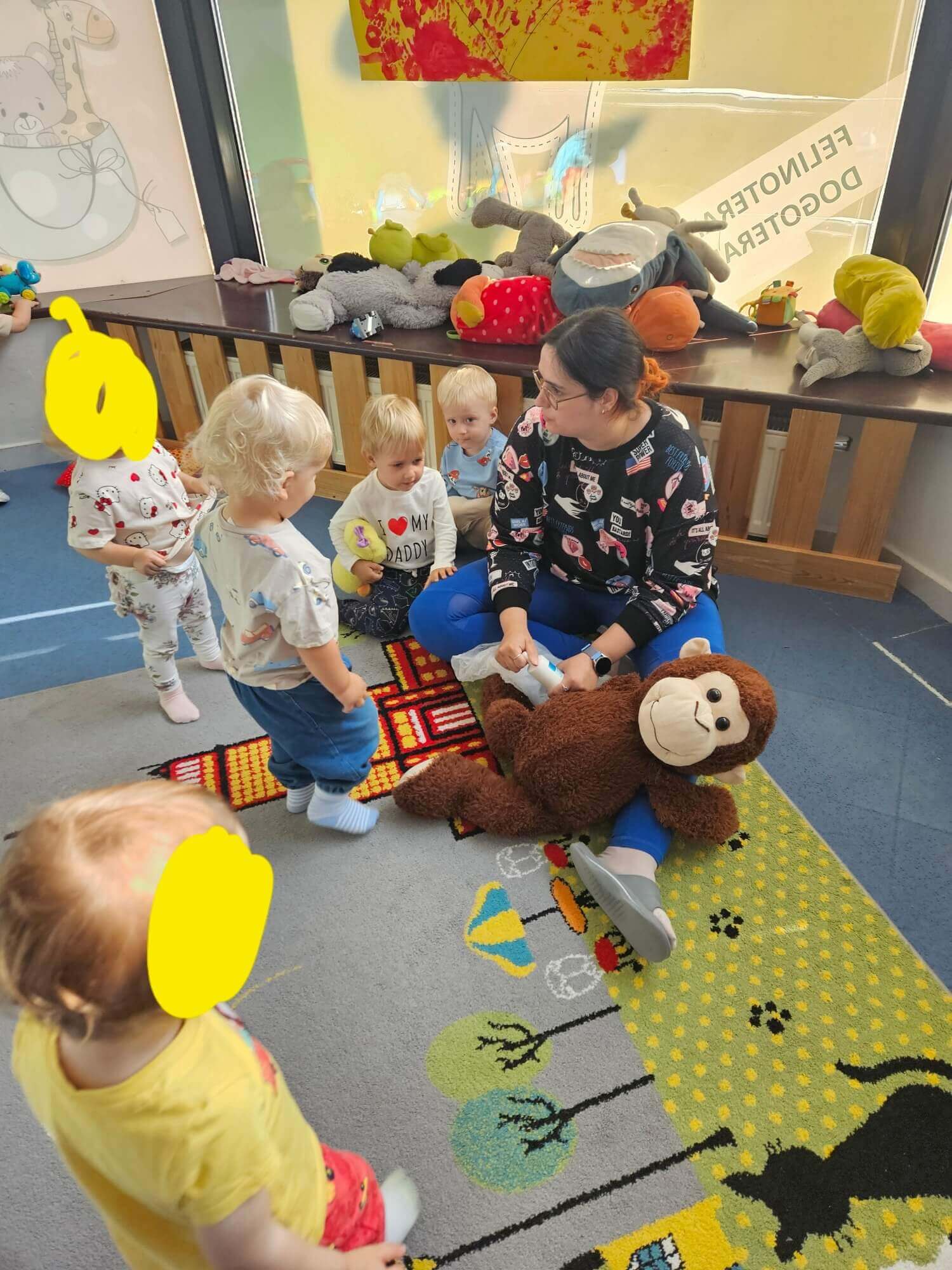 Podczas zajęć naszym wyjątkowym „pacjentem” była pluszowa małpka. Każde dziecko mogło samodzielnie opatrzyć jej „ranę”: oczyścić ją wodą utlenioną, delikatnie osuszyć, przykleić plasterek i założyć bandaż.